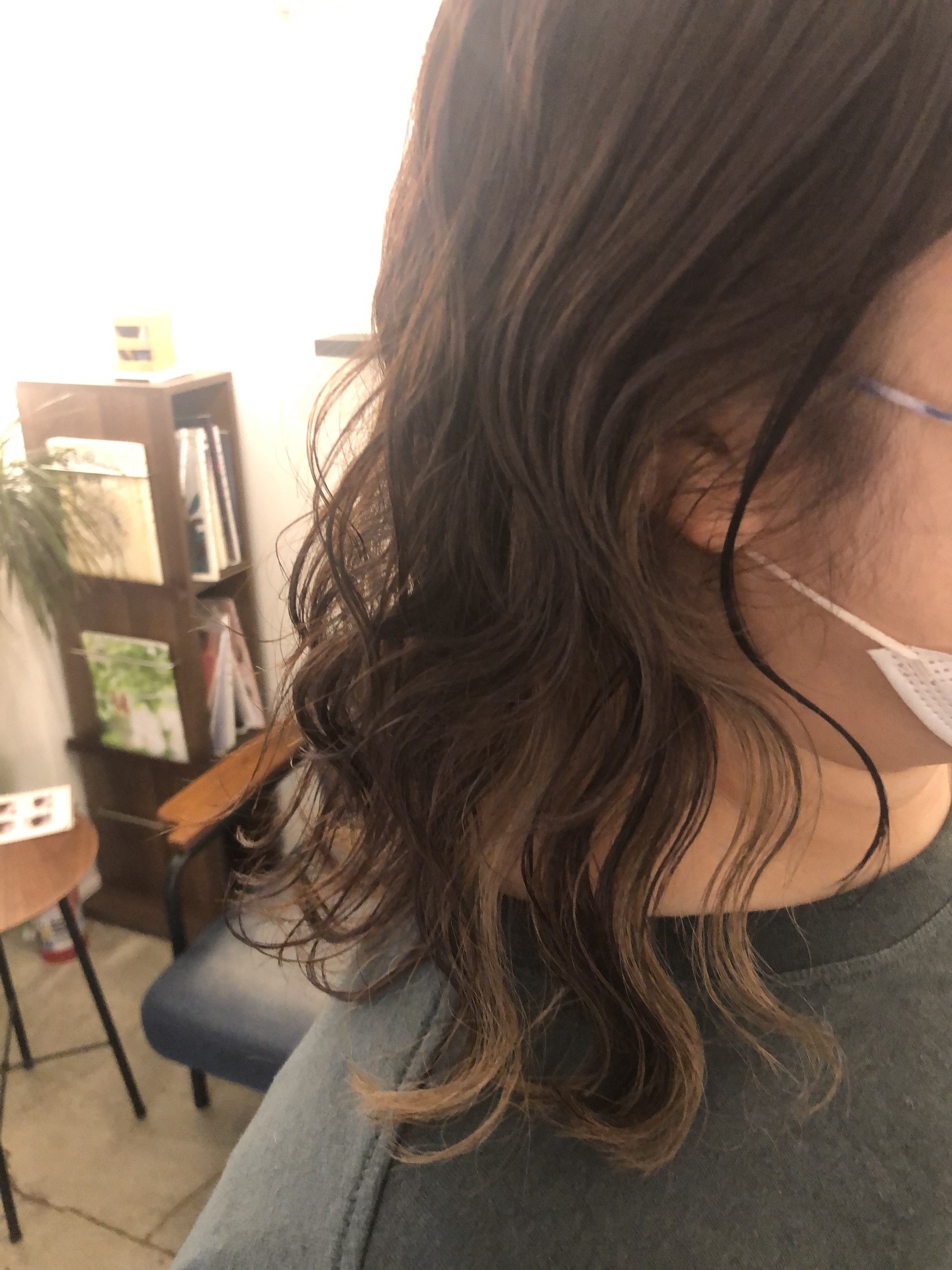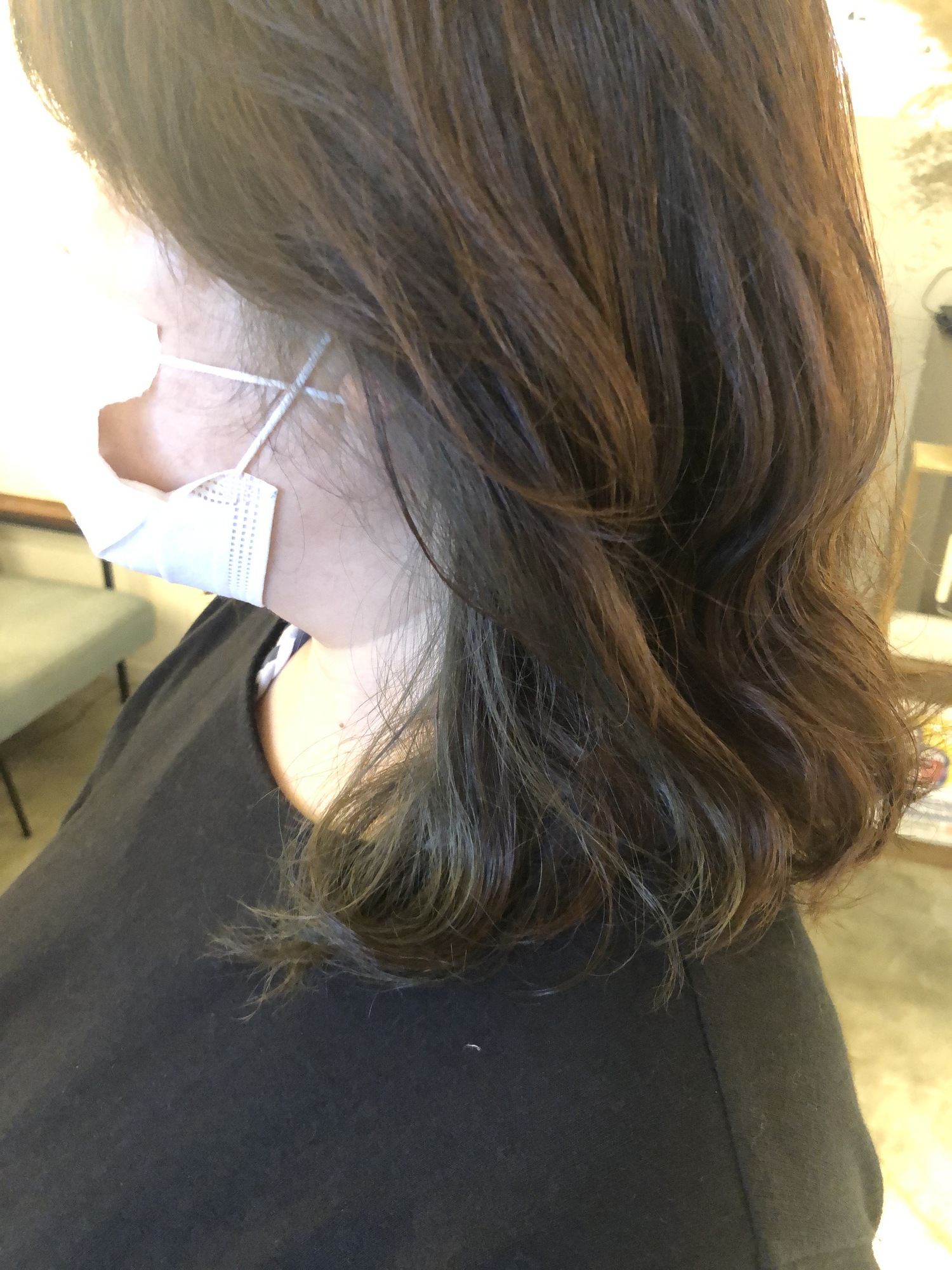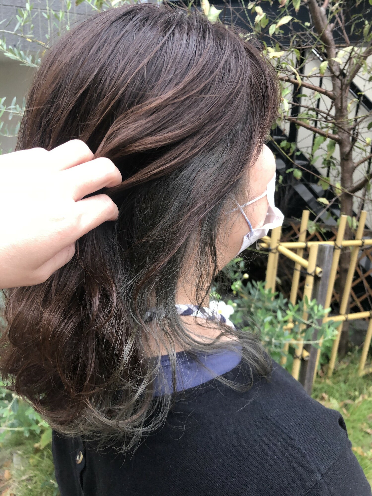 室内の照明と、外の光では印象がまた違いますが、色落ちも楽しめるカラーリングです。今は、ブリーチも一般的になってきて少し取り入れると気分も上がります!