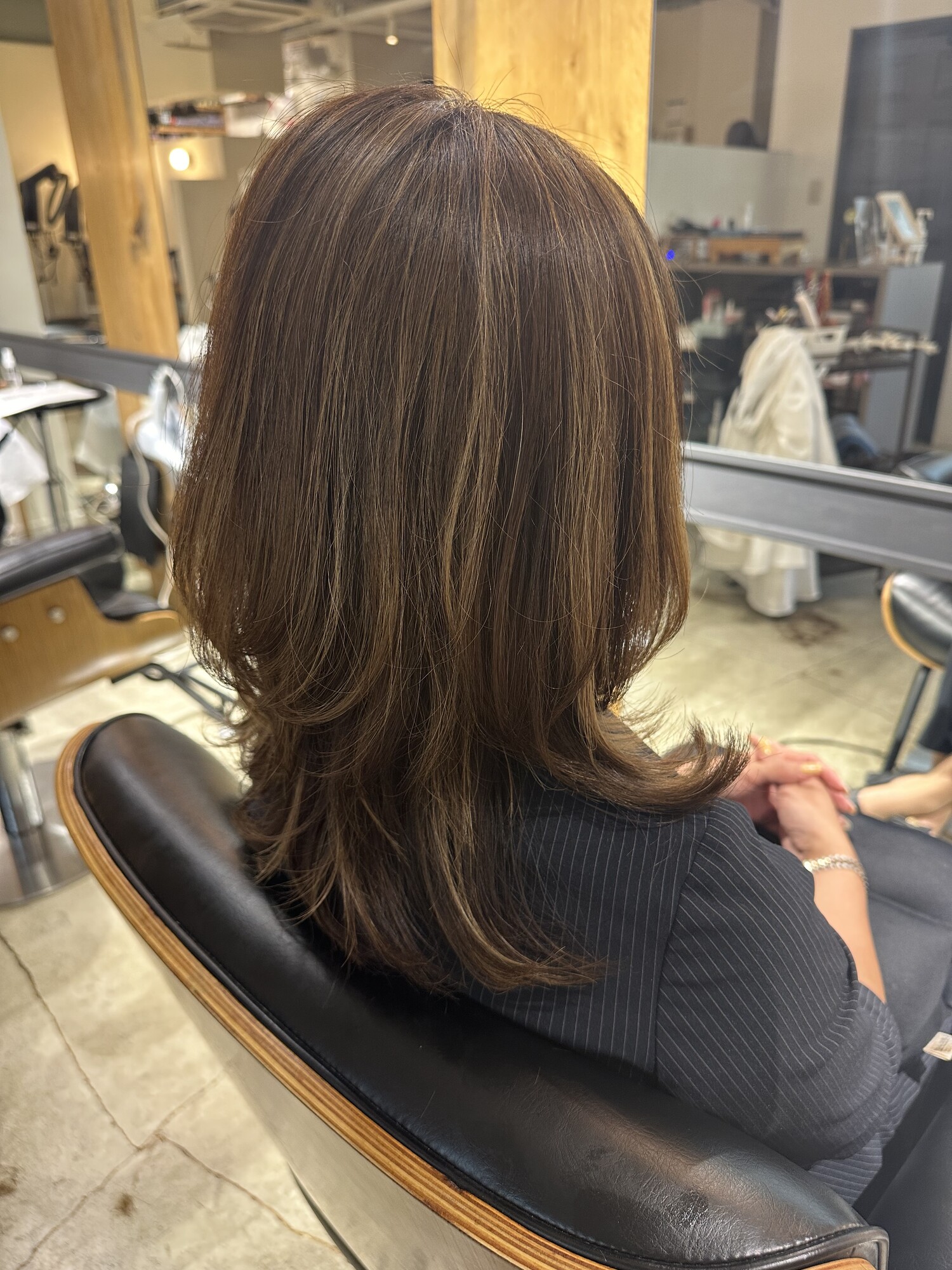 こちらのお客様は表面にレイヤーを入れて、お顔周りにも動きがつき、華やかな印象に。