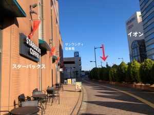 サンワシティの駐車場が左手にあり、右手にはイオンがでてきます♪