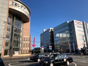 改札を出ると目の前に茶色い建物のサンワシティと右手に南都銀行がみえます。