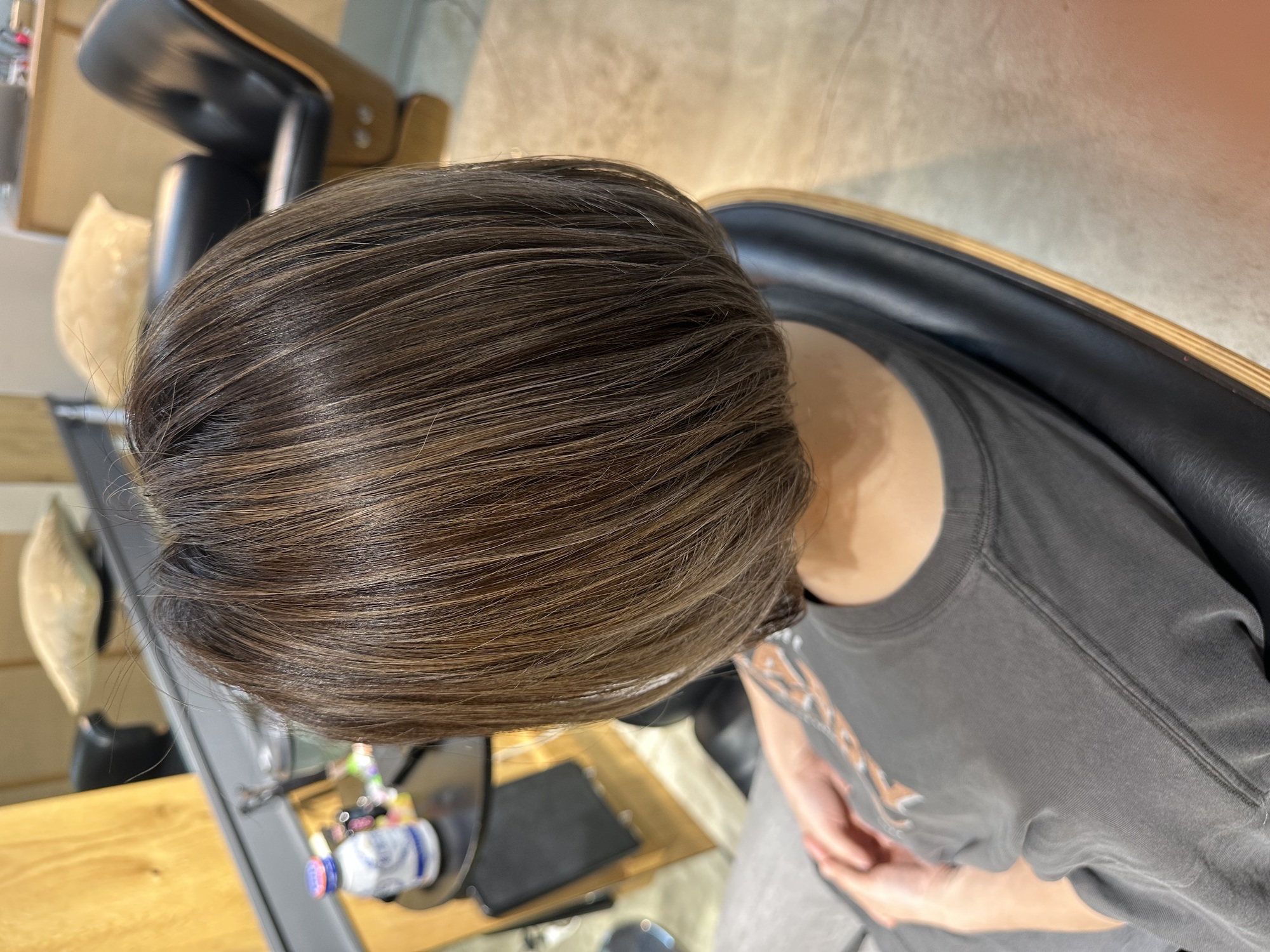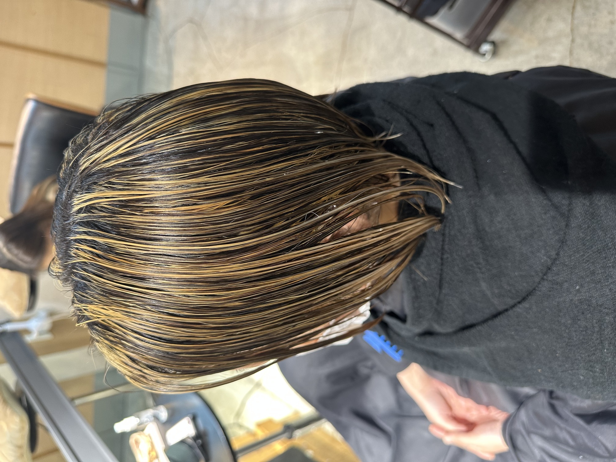 ハイライトのブリーチ抜きっぱなしのギラつきを抑えるグレージュをオンカラーしていきます。