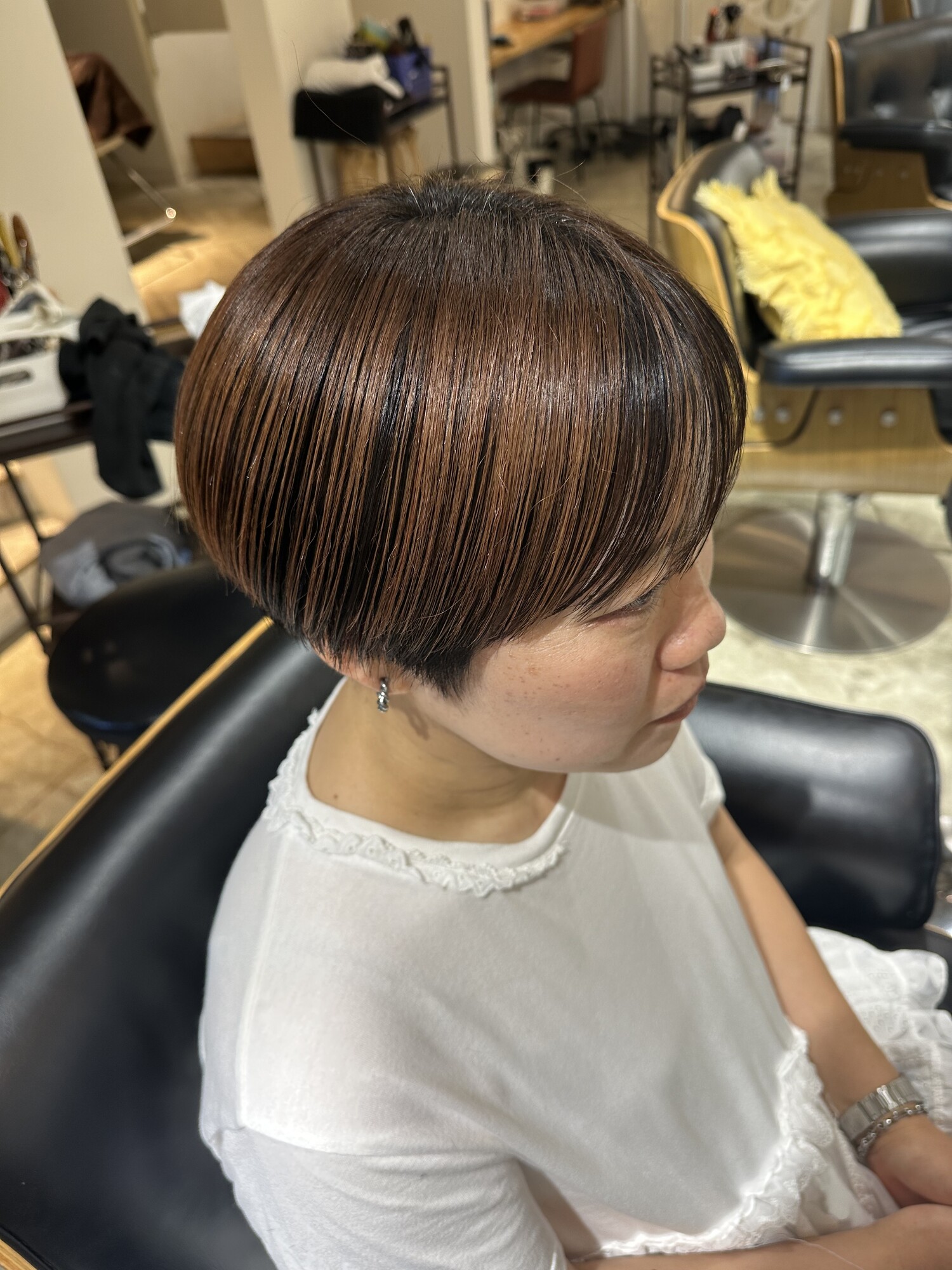 こちらのお客様はお顔周りの長さ設定で迷われていましたが、潔く短めにカットされました。
