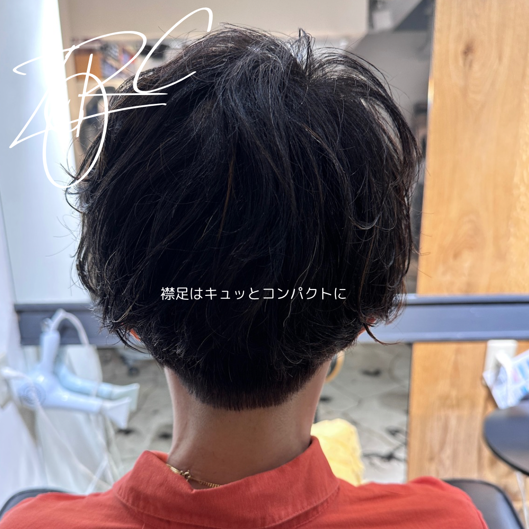 - 襟足や耳まわりはキュッとタイトに引き締め、トップに自然なボリュームを持たせ広がりやすい部分をうまくコントロールでき髪の癖を活かしたナチュラルで扱いやすい大人のマッシュショート。